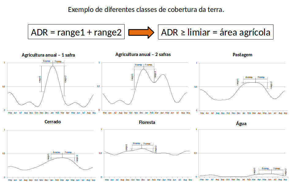 Devido a sua simplicidade, o classificador por paralelepípedo é rápido e fácil de implementar, exigindo menos recursos computacionais em comparação com métodos mais complexos. Ele também pode ser utilizado para ser aplicado sobre uma série temporal, uma vez que o perfil espectro temporal seja característico para cada classe. Assim, os atributos para a definição do paralelepípedo podem ser as datas e métricas fenológicas derivadas de séries temporais de índices espectrais (Seção Métricas Fenológicas). Um exemplo de como estabelecer os limiares para a classificação de uma área agrícola utilizando séries temporais de indices espectrais é apresentado abaixo (Figura 11.13). Nela, é possível observar que a classe de agricultura temporária apresenta um perfil espectral característico ao longo do tempo, com picos de reflectância em determinadas épocas do ano, o que facilita a definição dos limiares para a classificação utilizando uma range de tempo após localizar os picos de reflectância e que essa distância entre os valores de indices espectrais nestes pontos estabelecidos são sempre muito superiores aos valores de índices espectrais observados para as outras classes.