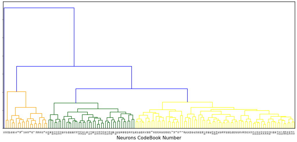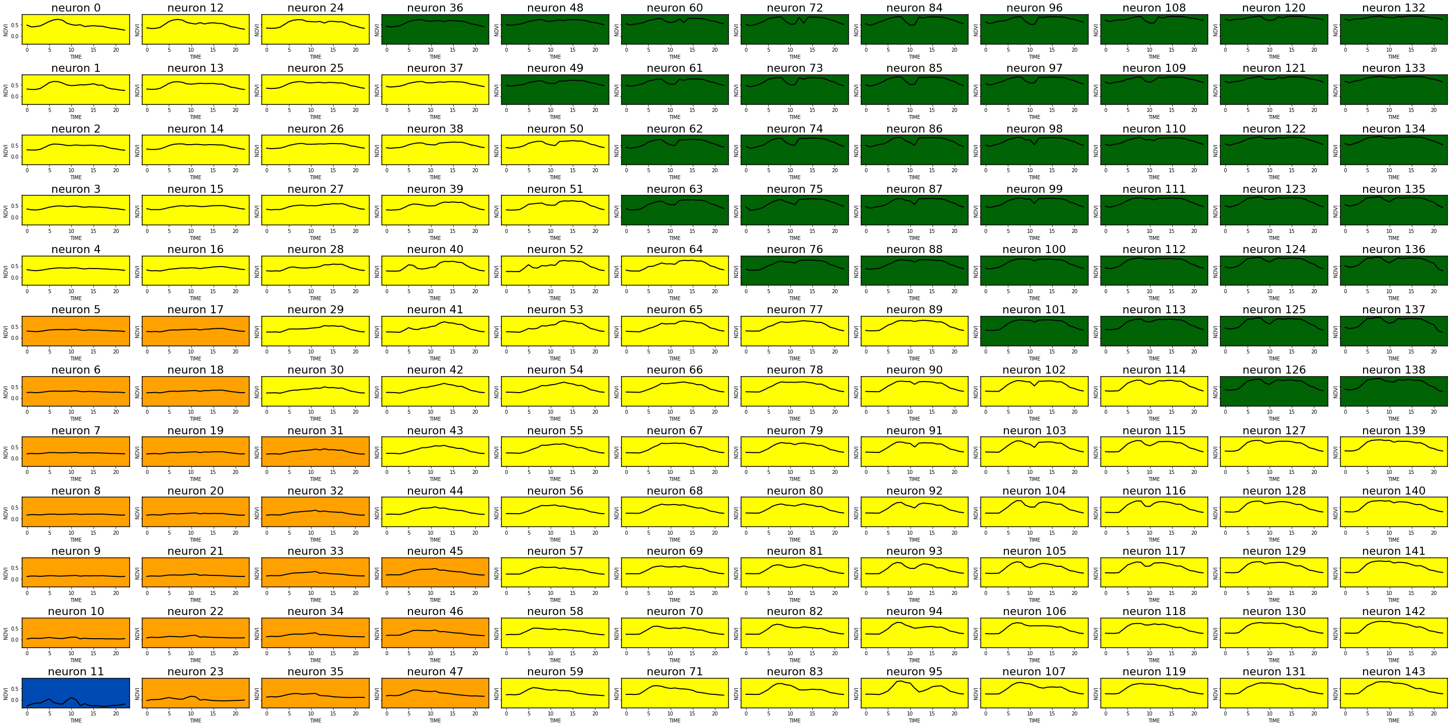 Para o resultado de 4 clusters, o mapa de saída do SOM, os vetores de peso de seus neurônios e a cor da classe associada a cada neurônio são mostrados na Figura 11.17 e o dendrogram gerado pelo método HCA para as 4 classes é mostrado na Figura 11.18. A Figura 11.19 ilustra os padrões das séries temporais NDVI associados a cada um dos 4 cluster.