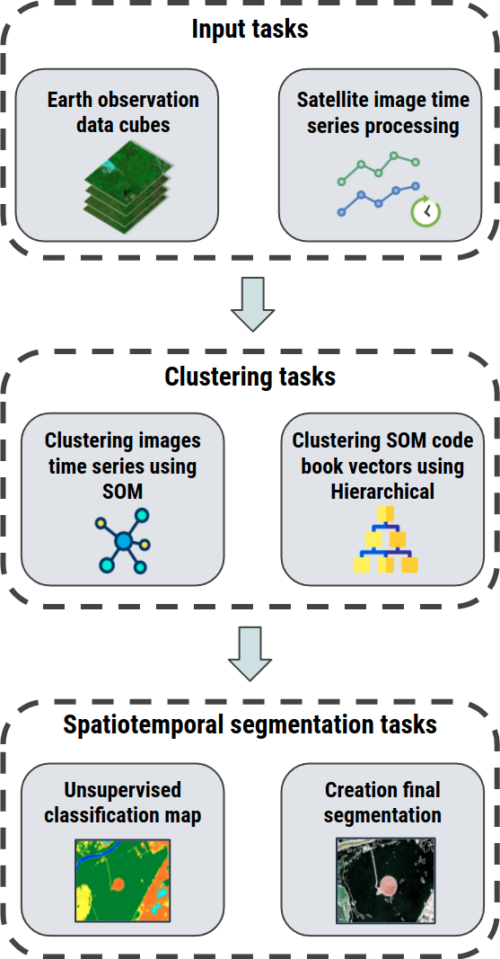 Figura 11.14 - Metodologia para mapear uso e cobertura da terra baseado em classificação não supervisionada de séries temporais de imagens de satélites usando SOM e HCA. Fonte: [194].