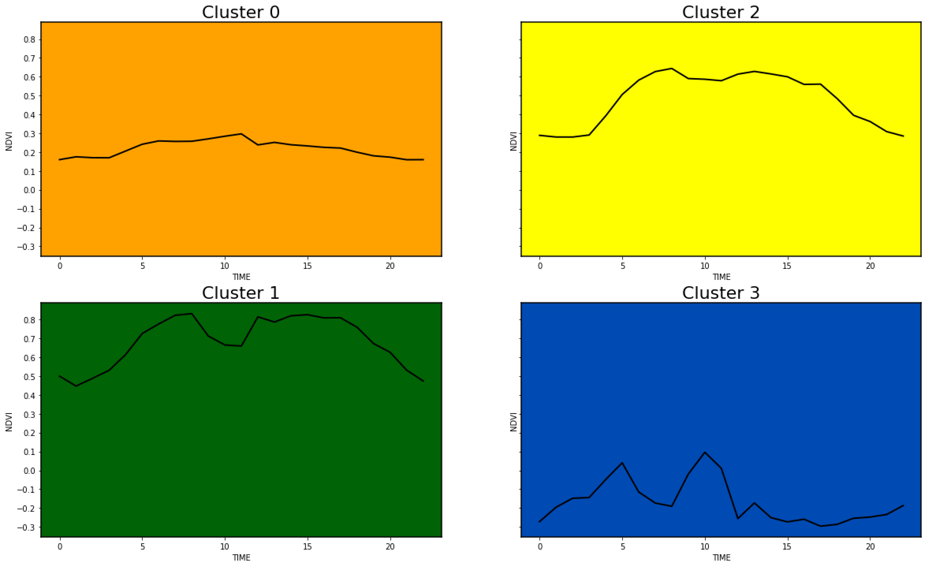 Figura 11.19 - Padrões das séries temporais NDVI associados a cada um dos 4 cluster.. Fonte: [194]