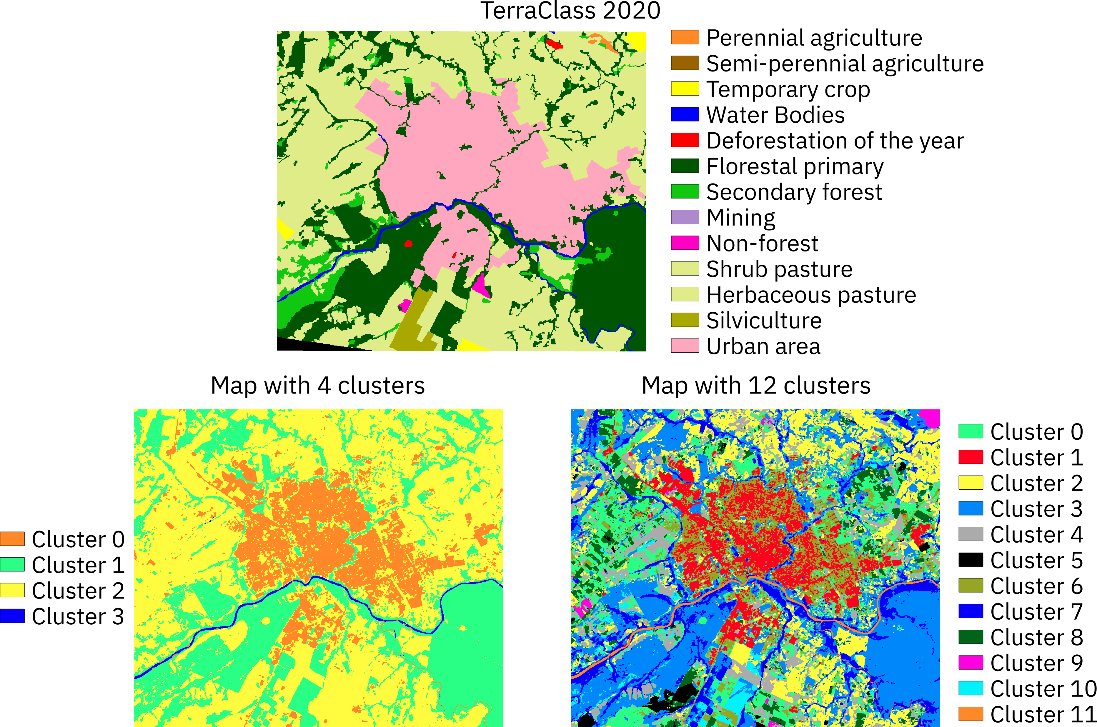 Essas séries foram agrupadas pelo método SOM, usando uma grade de 12 x 12 neurônios (144 neurônios). Após o agrupamento no SOM, os vetores de peso dos neurônios do mapa de saída foram agrupados usando o método HCA, com 4 e 12 grupos ou clusters finais (average linkage). O resultado da classificação não supervisionada é mostrado na Figura 11.16, com 4 e 12 grupos ou clusters. Além dos dois resultados, com 4 e 12 clusters, a Figura 11.16 apresenta o mapa de uso e cobertura da terra dessa área de estudo do TerraClass Cerrado 2020 para referência.