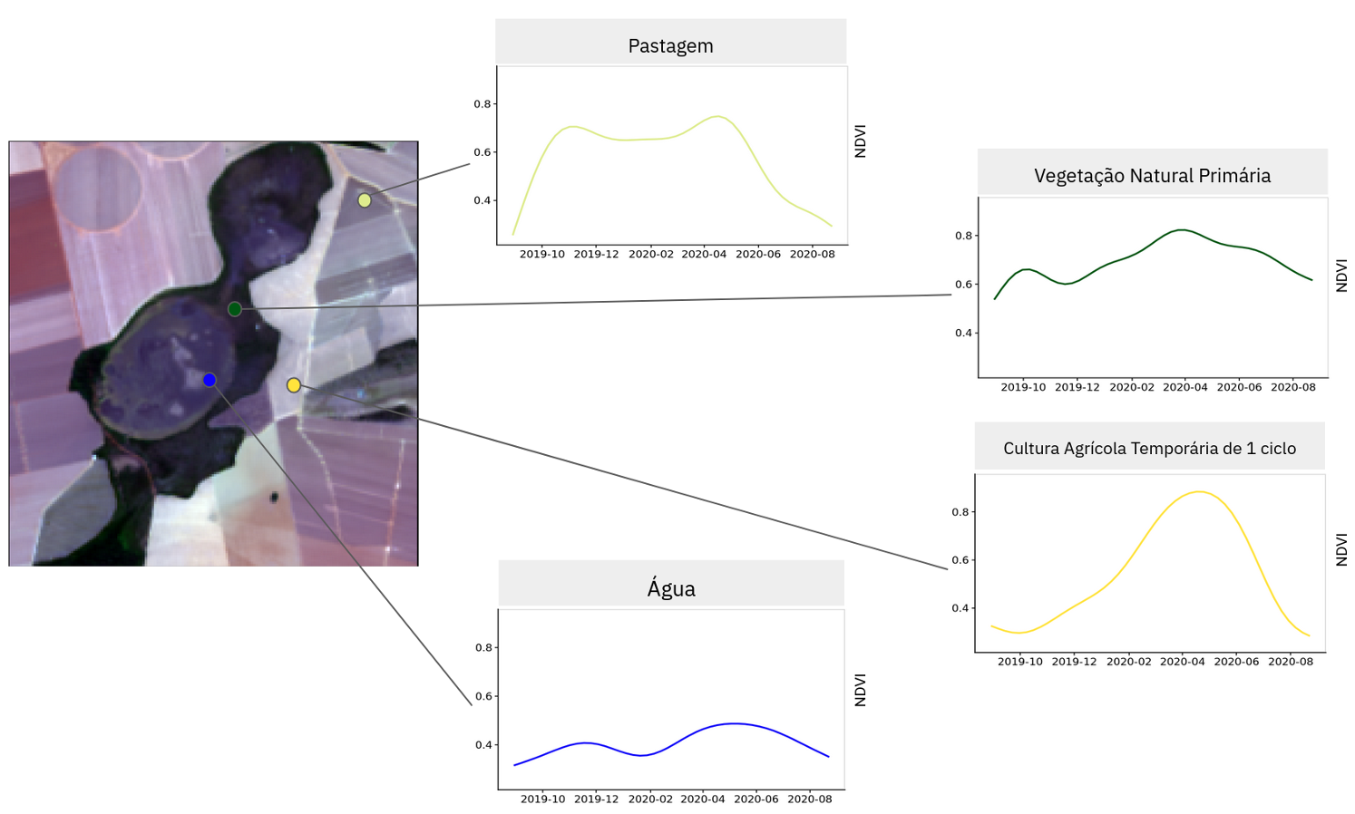 Figura 11.21 - Amostras de treinamento, suas localizações, suas séries temporais NDVI e suas classes.