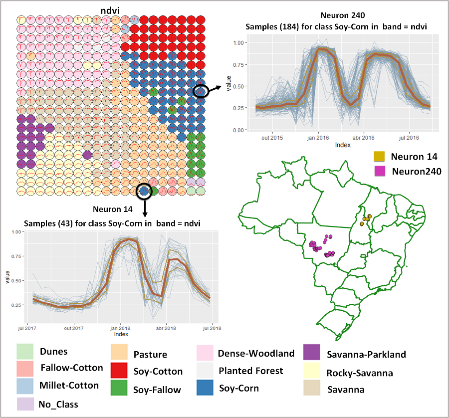 A Figura 11.22 ilustra o método proposto por Santos et al. [197] para avaliação da qualidade das amostras de treinamento baseado no SOM. Nessa figura é possível observar que amostras de uma mesma classe de uso e cobertura da terra (soja-milho) que apresentam padrões diferentes, ou seja, séries temporais NDVI diferentes, são alocadas em neurônios distantes no mapa gerado pelo SOM. Ao plotar no espaço, é possível observar que essas amostras são de estados brasileiros distintos, que provavelmente tem calendários agrículos diferentes. Ao analisar a qualidade das amostras de treinamento, todas essas variações espaço-temporais das amostras de uso e cobertura da terra devem ser levadas em consideração e o método proposto por Santos et al. [197] auxilia os especialistas a fazerem essas avaliações.