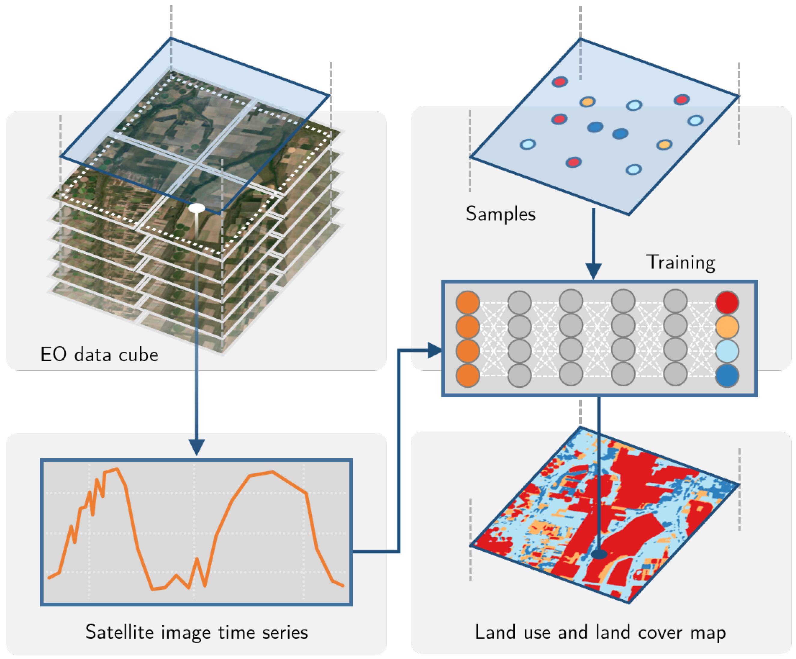 Como ilustrado na Figura 11.20, cada amostra de treinamento é representada por uma classe de uso e cobertura da Terra, uma localização (longitude e latitude) e por um período da respectiva classe. A partir das informações das amostras, são recuperadas as séries temporais de imagens a partir de cubos de dados de observação da Terra. Cada série temporal de imagem é rotulada, ou seja, tem uma classe associada. A Figura 11.21 ilustra um conjunto de amostras de treinamento, suas localizações espaciais, suas séries temporais NDVI e suas classes de uso e cobertura da Terra. É importante notar que séries temporais de imagens NDVI associadas a diferentes classes de uso e cobertura da terra tem padrões distintos, como ilustrado na Figura 11.21 e nas Seções Séries Temporais de Imagens e Tipos de Uso e Cobertura da Terra e Séries Temporais de Imagens e Tipos de Agricultura . Essas séries são usadas então para treinar o classificador e gerar um modelo preditivo. Usando esse modelo, o método classifica todas as séries temporais do cubo de dados que não são rotuladas e, finalmente, gera um mapa de uso e cobertura da terra.