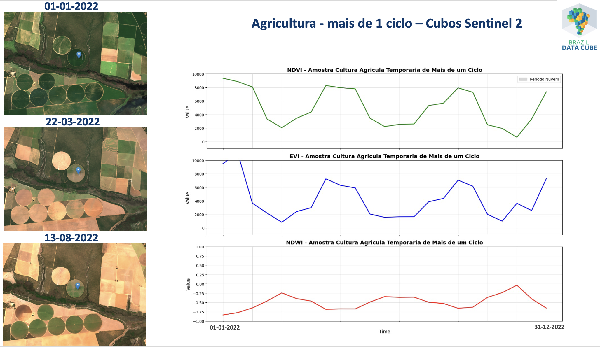 Figura 11.6 - Séries temporais extraídas de um cubo de dados de imagens Sentinel2 associadas à uma localização espacial classificada como Agricultura de Mais de 1 Ciclo pelo TerraClass Cerrado 2022.