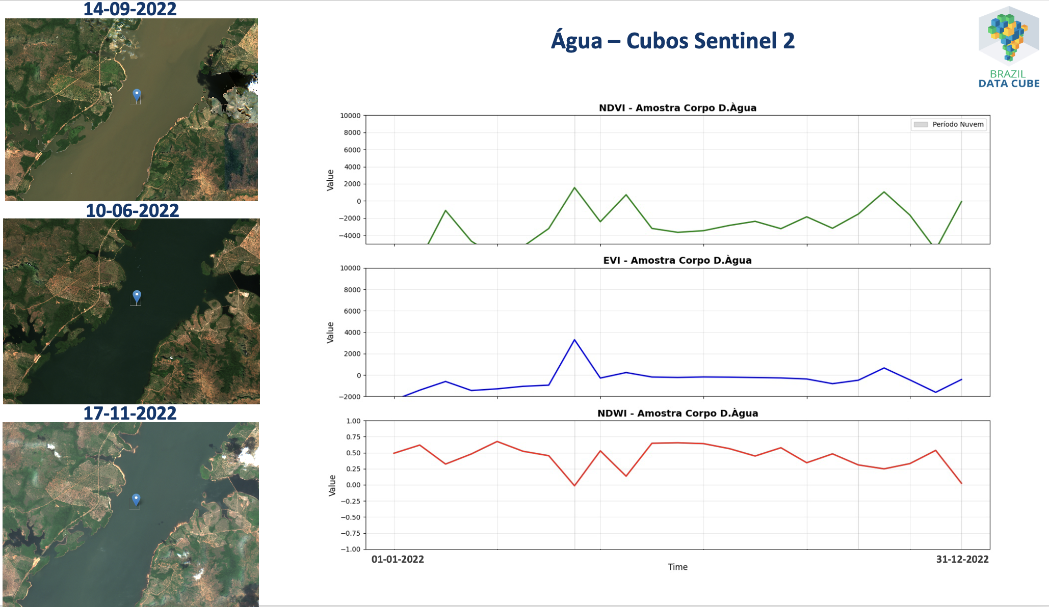 Figura 11.4 - Séries temporais extraídas de um cubo de dados de imagens Sentinel2 associadas à uma localização espacial classificada como Água pelo TerraClass Cerrado 2022.