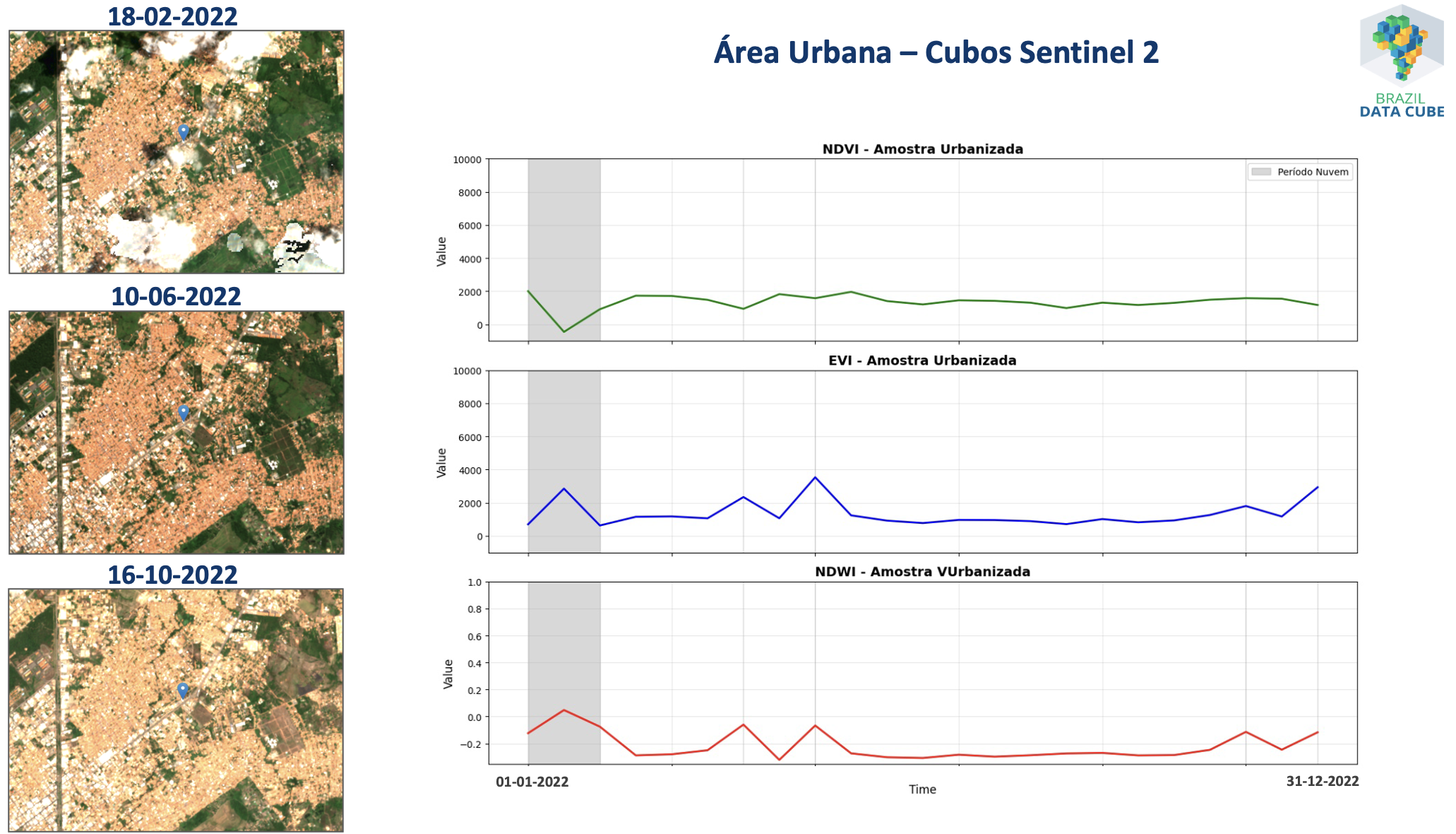 Figura 11.2 - Séries temporais extraídas de um cubo de dados de imagens Sentinel2 associadas à uma localização espacial classificada como Área Urbana pelo TerraClass Cerrado 2022.