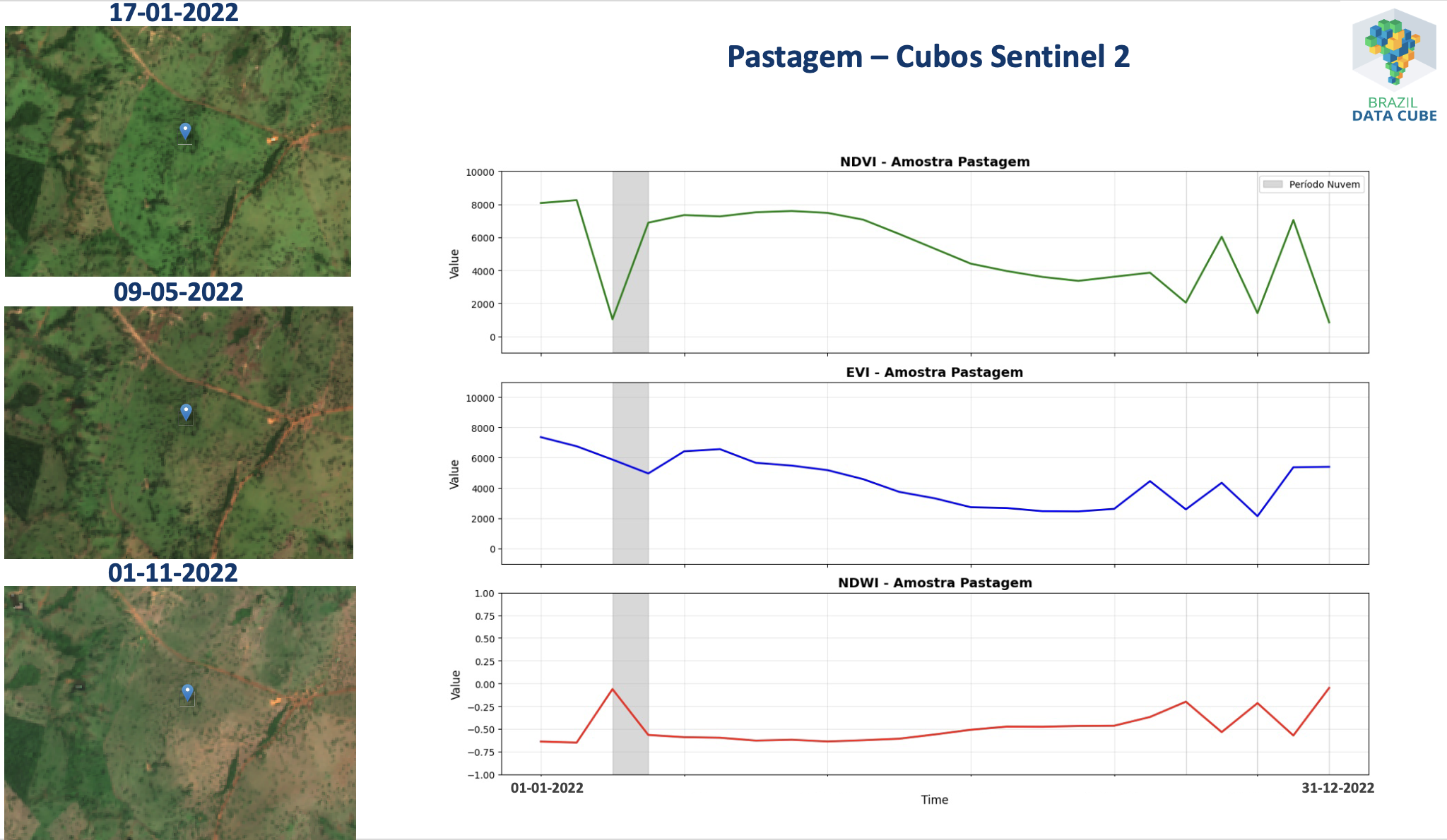 Figura 11.3 - Séries temporais extraídas de um cubo de dados de imagens Sentinel2 associadas à uma localização espacial classificada como Pastagem pelo TerraClass Cerrado 2022.