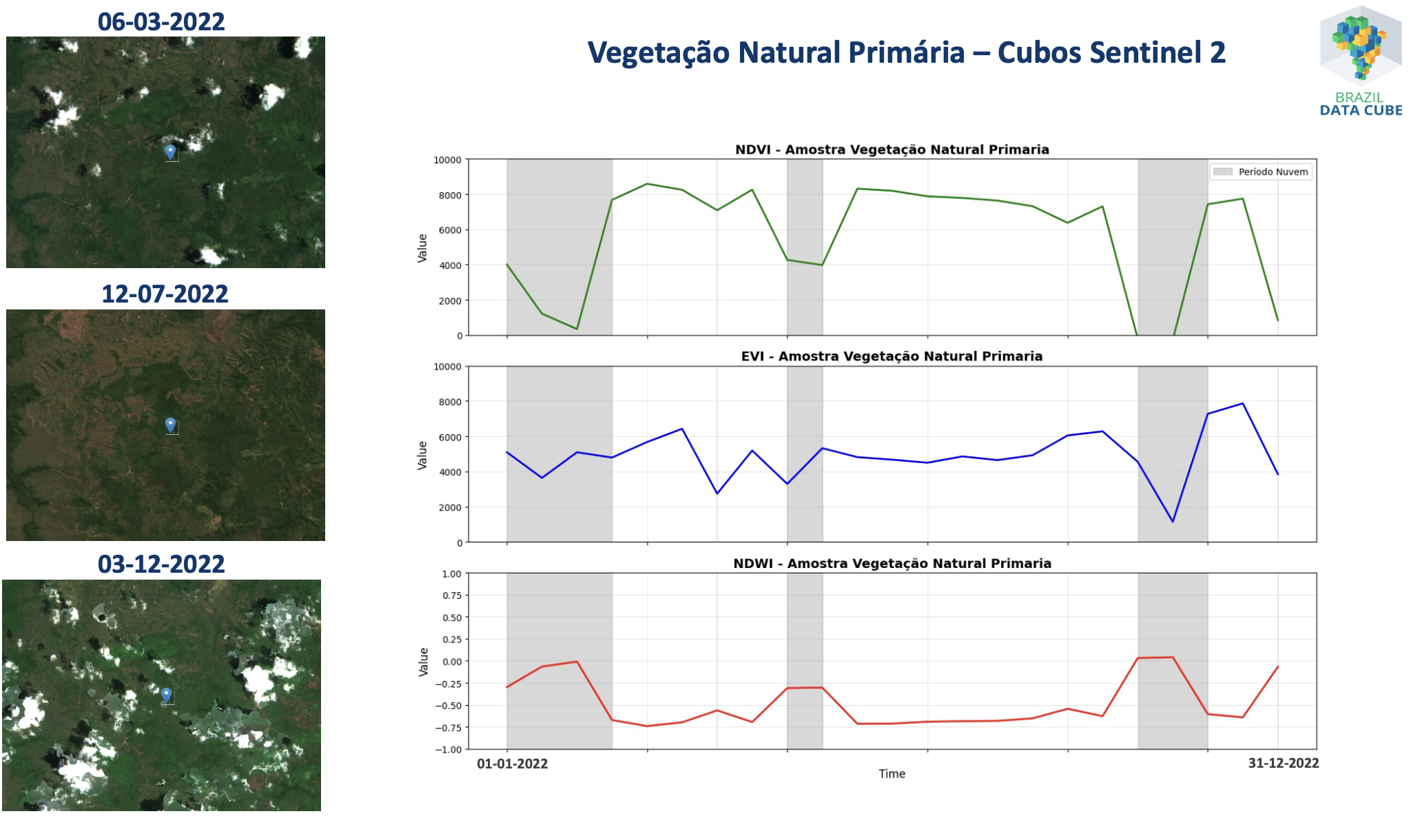 Essa seção ilustra séries temporais extraídas de cubos de dados de imagens do satélite Sentinel-2 para diferentes tipos de uso e cobertura da terra explicados na Seção sobre Uso e Cobertura da Terra. Esses cubos de dados de imagens do satélite Sentinel-2 são produzidos e disponibilizados pelo projeto Brazil Data Cube, como compostos temporais de 16 dias e resolução espacial de 10 metros.