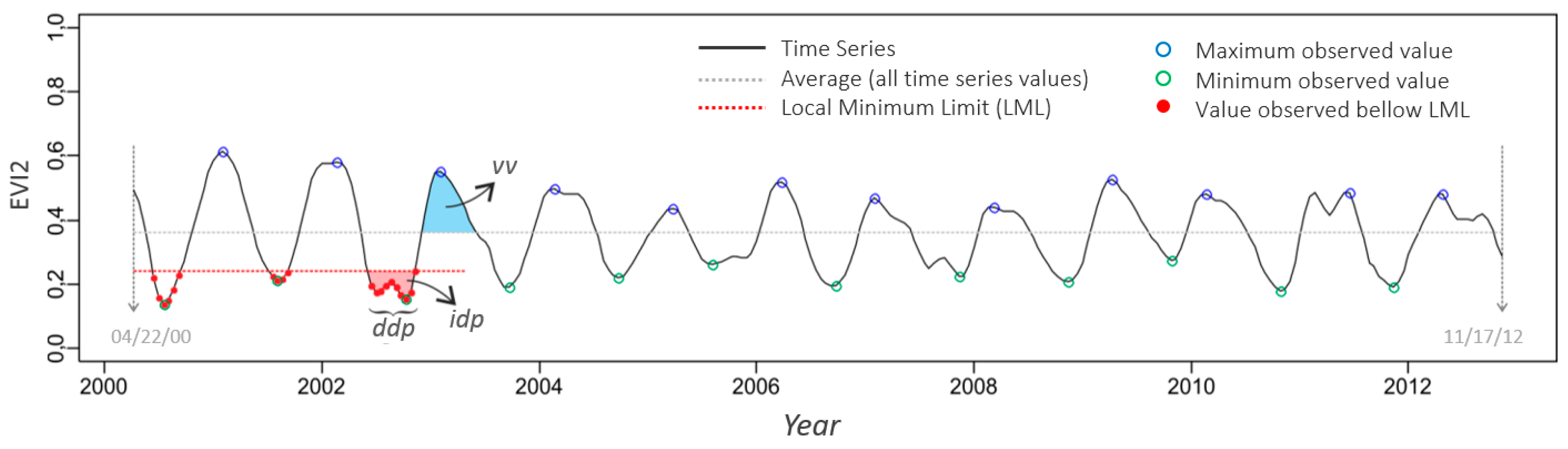 Figura 5.4 - Série temporal média do EVI2 de uma pastagem estudada, destacando o Limite Mínimo Local (LML) e a duração do período seco (ddp), a intensidade do período seco (idp) e o vigor vegetativo (vv) para o ano agrícola 2002/2003.