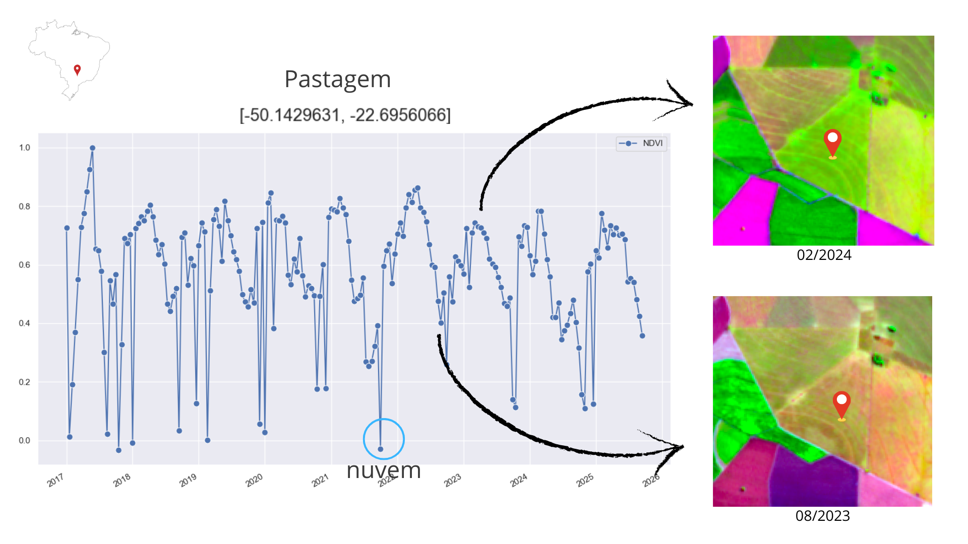 Figura 5.7 - Série temporal NDVI para uma pastagem (-50.143; -22.696) utilizando dados Sentinel-2 (2017-2025). As imagens à direita mostram a composição colorida RGB (B11, B8, B4), sendo a superior para a estação de chuva e a inferior para a estação de seca.