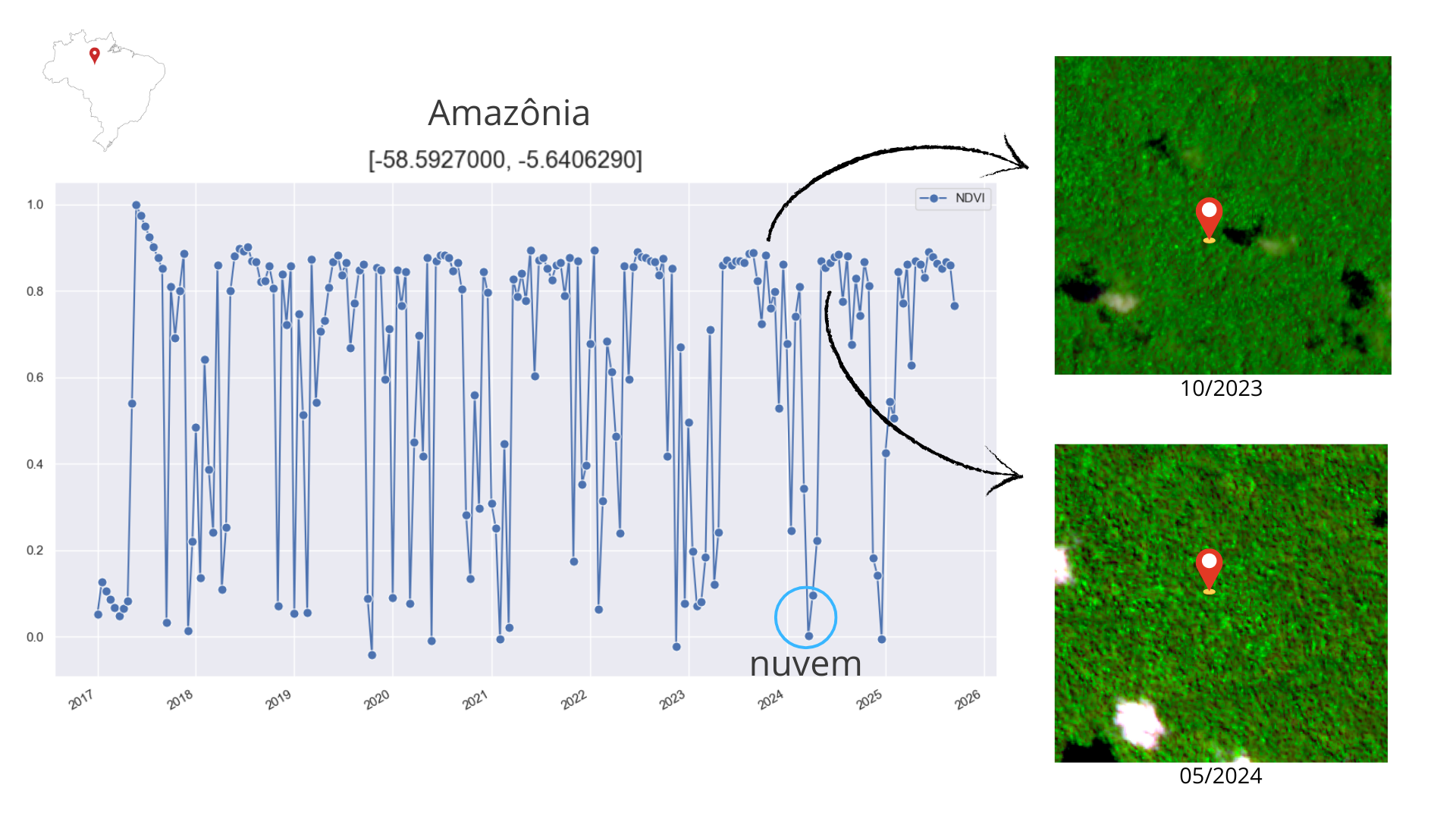 Figura 5.8 - Série temporal NDVI para uma área da floresta Amazônica (-58.592; -5.641) utilizando dados Sentinel-2 (2017-2025). As imagens à direita mostram a composição colorida RGB (B11, B8, B4), sendo a superior para o início da estação chuvosa e a inferior para o início da estação seca.
