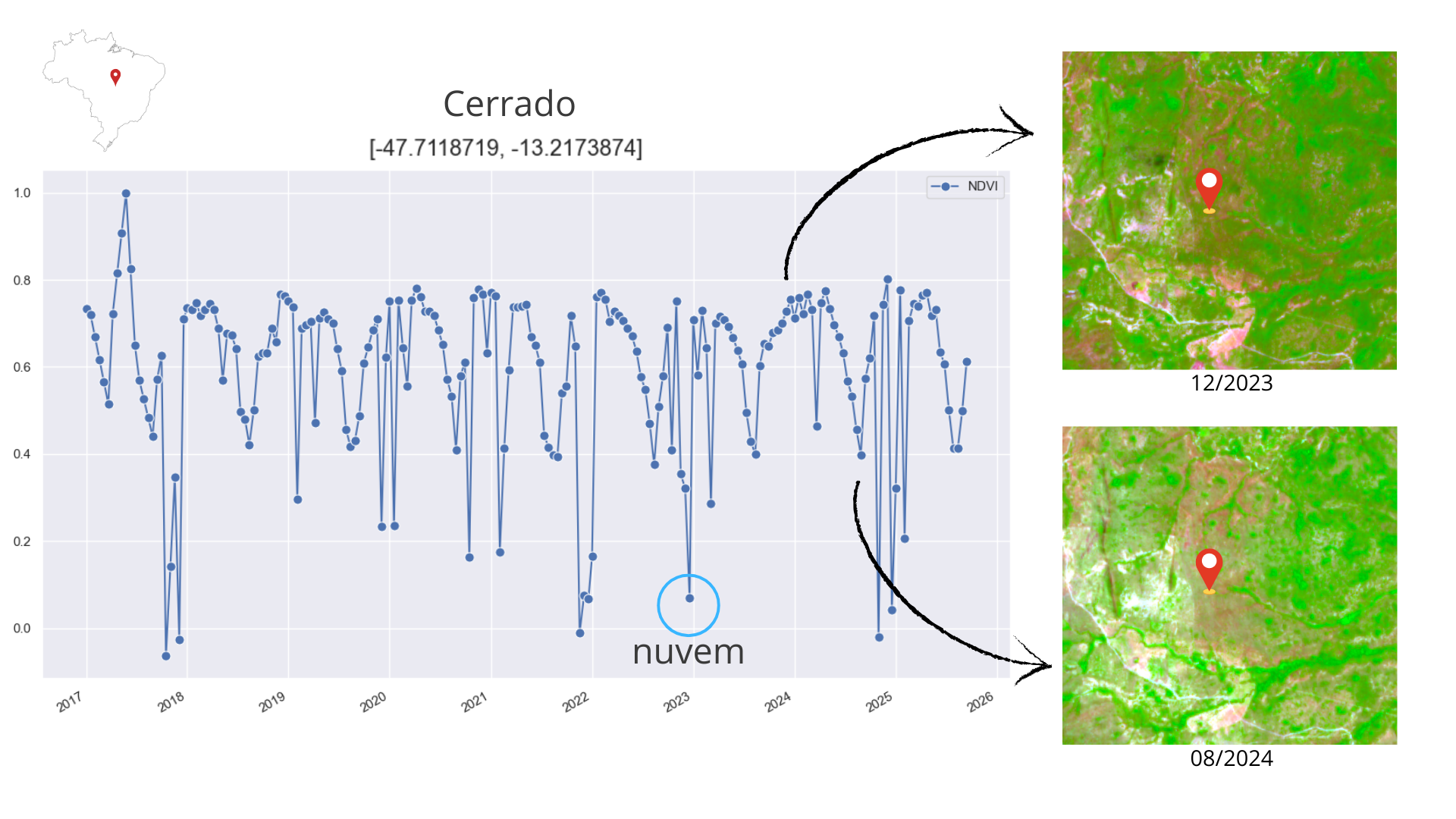 Figura 5.9 - Série temporal NDVI para uma área do cerrado (-47.712; -13.217) utilizando dados Sentinel-2 (2017-2025). As imagens à direita mostram a composição colorida RGB (B11, B8, B4), sendo a superior para a estação chuvosa e a inferior para a estação seca.